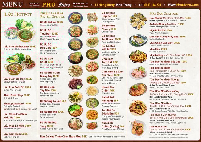 Located in the heart of Nha Trang, Phú Bistro offers a rich selection of dishes to satisfy every craving — from classic pho and flavorful vermicelli bowls to hearty rice plates like Luklak and stir-fried lemongrass chili beef. Dive into our sizzling hotpots, juicy Aussie-style steaks, grilled beef specialties, and fresh seafood options, all prepared with vibrant Vietnamese flair.