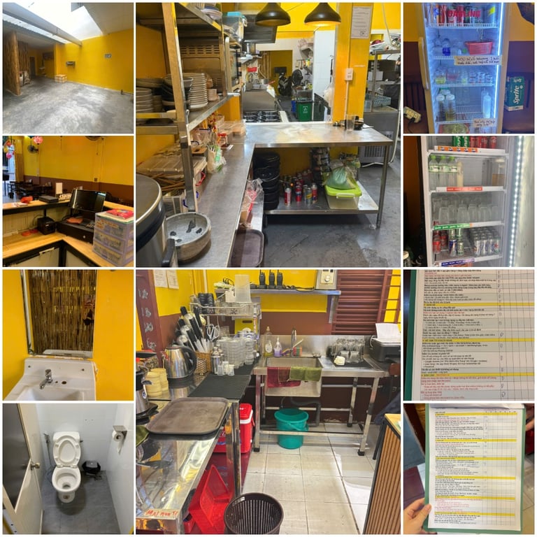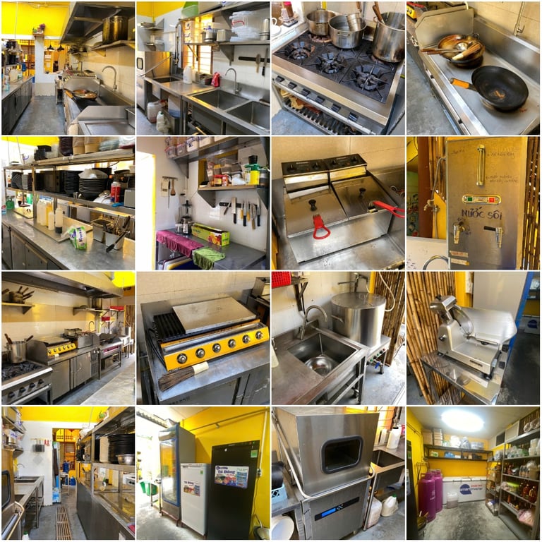 - Thiết bị bếp đầy đủ (Bếp nấu, bếp nướng, lò chiên, chảo khò, máy rửa bát, máy cắt thịt, tủ đông, tủ lạnh... Hệ thống hút mùi công nghiệp, đường gas còn mới,...)